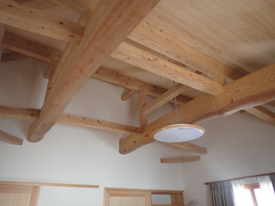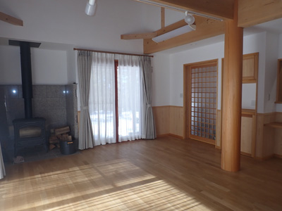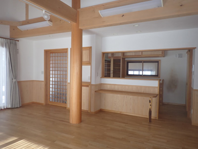 | 1階リビング…薪ストーブも設置、台所からは対面キッチンに。 | ||